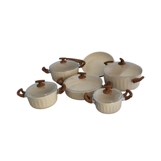 از نظر جنس و ساختار، سرویس اویز با بهرهگیری از مواد با کیفیت، دوام و کارایی بالایی را ارائه میدهد. هم فضای داخلی و هم سطح بیرونی تمام ظروف این سرویس دارای پوشش گرانیتی هستند. پوشش گرانیت به دلیل خواص نچسب فوقالعاده، مقاومت بالا در برابر خط و خش و سایش، و دوام طولانیمدت شناخته شده است. این پوشش باعث میشود غذا به راحتی از سطح جدا شود و نیاز به استفاده از مقادیر زیاد روغن به حداقل برسد که این خود به سلامتی بیشتر غذا و شستشوی آسانتر ظروف کمک شایانی میکند.